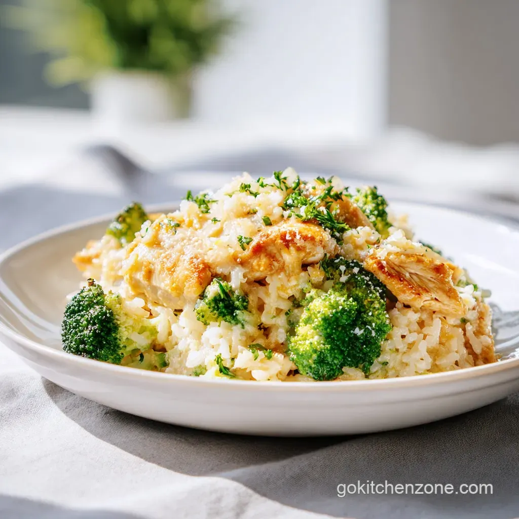 - Cheesy chicken broccoli rice bake: Transfer the finished stovetop mixture to a baking dish, top with extra cheese and panko breadcrumbs, and broil at 400°F (200°C) for 3 minutes.