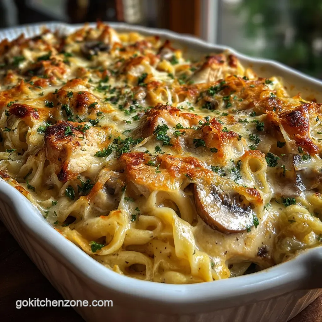 Tetrazzini is a baked casserole dish, while Alfredo is typically a stovetop pasta dish. Alfredo relies primarily on cream, butter, and Parmesan for its sauce, whereas Tetrazzini incorporates mushrooms, often sherry, and is finished by baking to achieve a crispy topping.