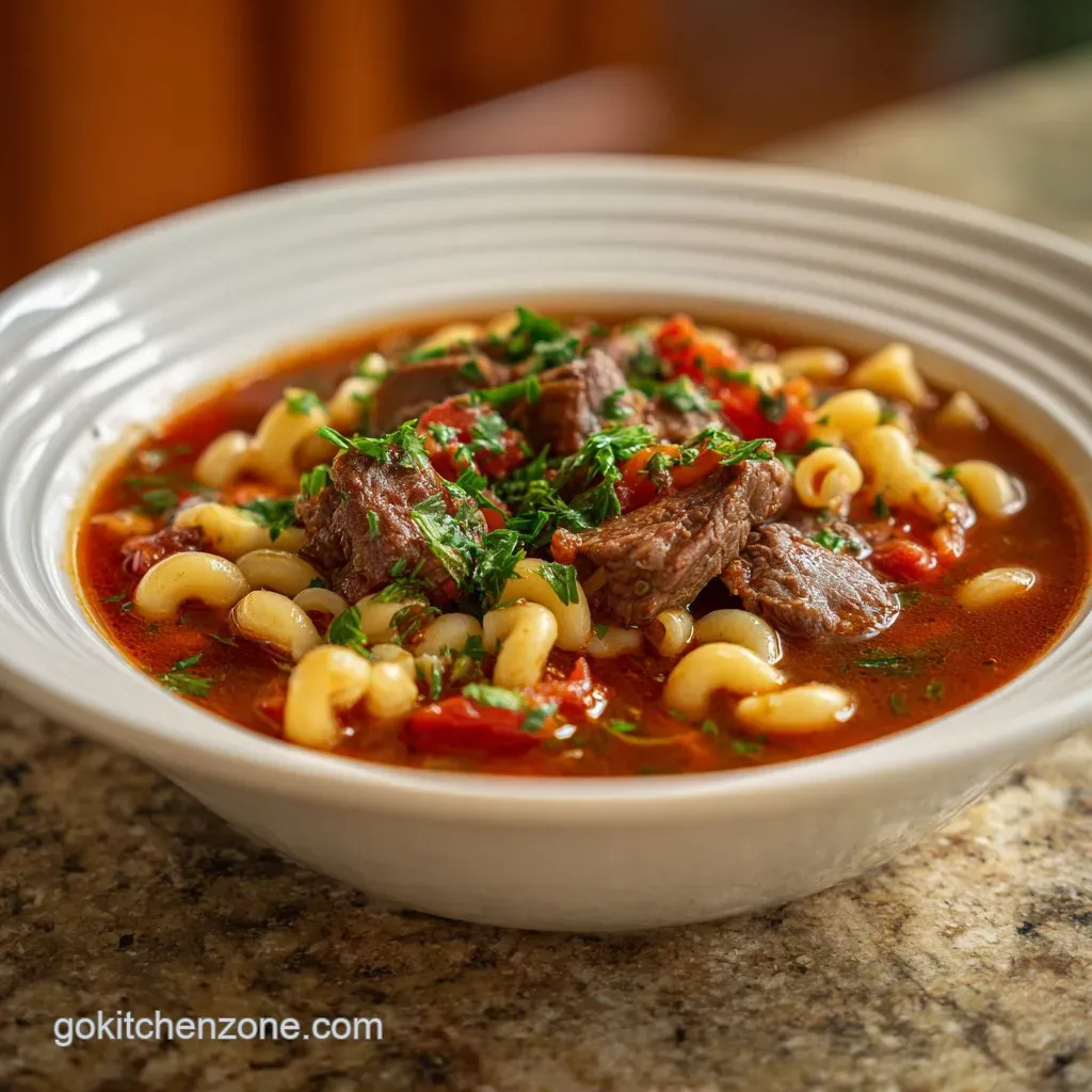 - Flavor/Texture Hook: Savory, beefy, and slightly tangy with tender macaroni.